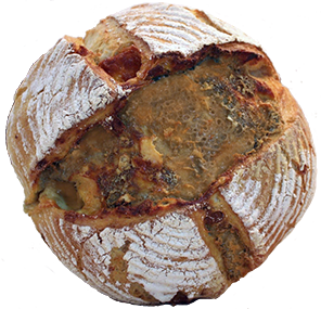 HOGAZA DE ACEITUNASIngredientes: harina ecológica de trigo, agua, masa madre de cultivo de trigo, aceitunas verdes (9%), aceitunas negras (9%),tappanade de aceituna negra (1%) y sal. Peso: 850gr. | |